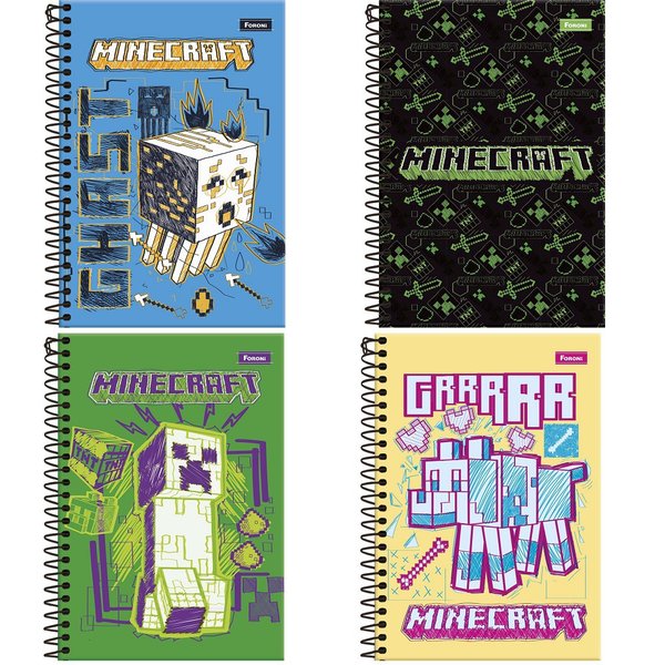 O caderno espiral universitário Minecraft possui capa dura com laminação fosca com a parte interna decorada, verniz reserva, bolsa plástica para guardar trabalhos e anotações, folha com adesivos funcionais, folhas pautadas e espiral preto. Ideal para o dia a dia na escola ou na faculdade.