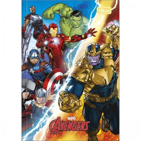 Caderno Brochura Capa Dura 1/4 Avengers, 48 folhas, possui capa dura com a parte interna decorada, folha dupla de adesivos e folhas pautadas.