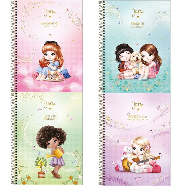 Caderno Espiral 1/4 Jolie. Possui 80 folhas, capa dura, adesivos e folhas pautadas. Ideal para o dia a dia na escola.