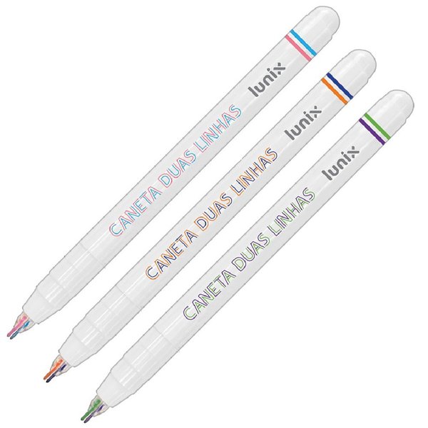A Caneta Duas Linhas Lunix possui duas pontas de poliéster para efeito decorativo. O produto, com tinta à base de água, está disponível nas cores sortidas verde e roxa; azul-marinho e laranja e azul-claro e rosa.