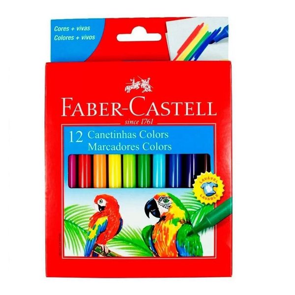 Caneta Hidrográfica Faber-Castell, tinta lavável na maioria dos tecidos, produto atóxico, pontas médias e macias.