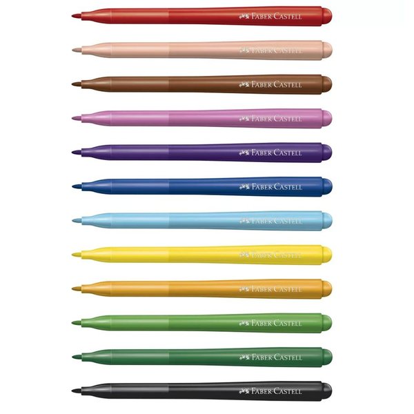 Caneta Hidrográfica Faber-Castell, tinta lavável na maioria dos tecidos, produto atóxico, tecnologia com sistema de amortecimento contra impactos na ponta, garantindo maior resistência e durabilidade.