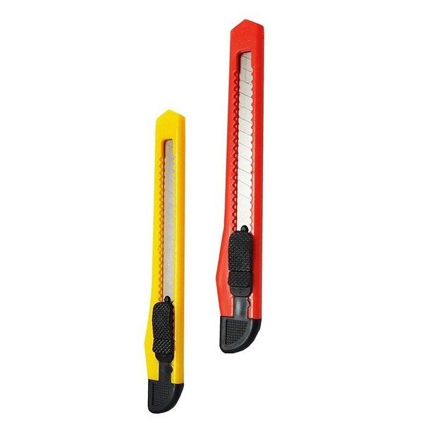 Estilete estreito com lâmina estreita de aço de alta resistência, feito em plástico com trava de segurança para evitar acidentes com a lâmina.