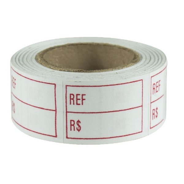 Etiqueta de preço de cor branca com tarja vermelha, divisão para referência e preço, adesiva, fabricada em papel não plastificado, modelo 511, medidas 25 mm x 18 mm cada, rolo com 250 unidades.