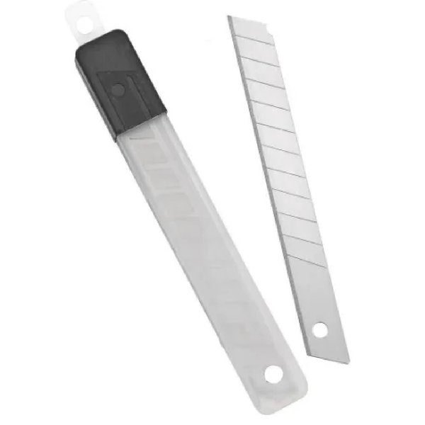 Caixa com 10 lâminas de aço de alta resistência para estilete 9mm.