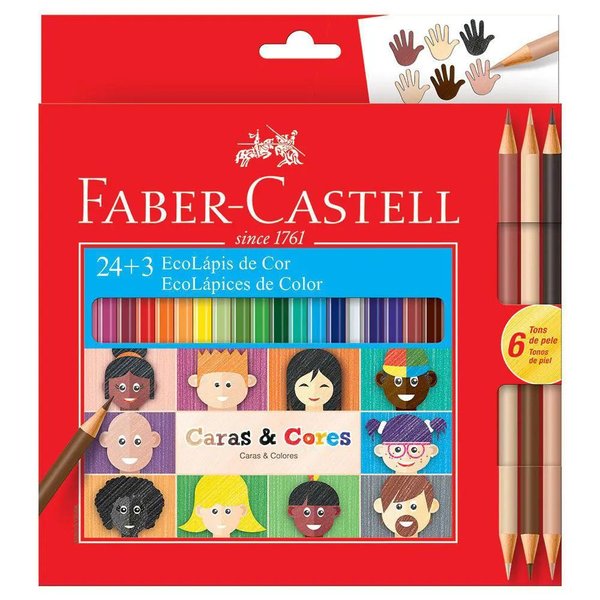 Embalagem com 24 cores clássicas e 3 lápis bicolor (totalizando 6 tons de pele diferentes).