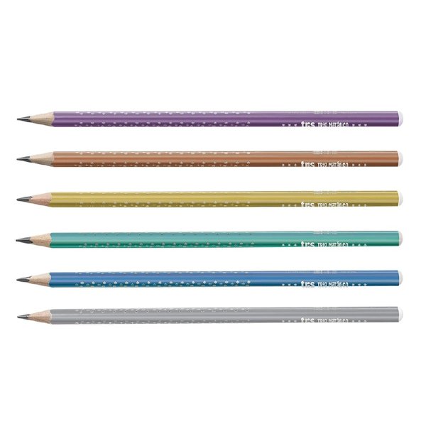 Lápis grafite de madeira reflorestada, com corpo triangular em cores metálicas e estampa metalizada de estrelinhas! Traço HB e 6 lindas cores pra você escolher!