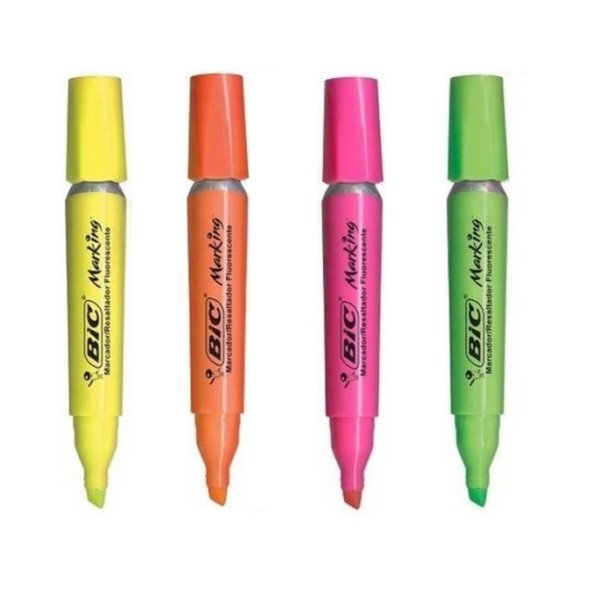 Marcador de Texto Fluorescente BIC destaca-se pelo brilho de alta intensidade. Com ponta resistente, possibilita uma escrita firme, sem afundamento da ponta chanfrada, ela também permite a marcação em traçado duplo: fino para sublinhar e grosso para destacar.