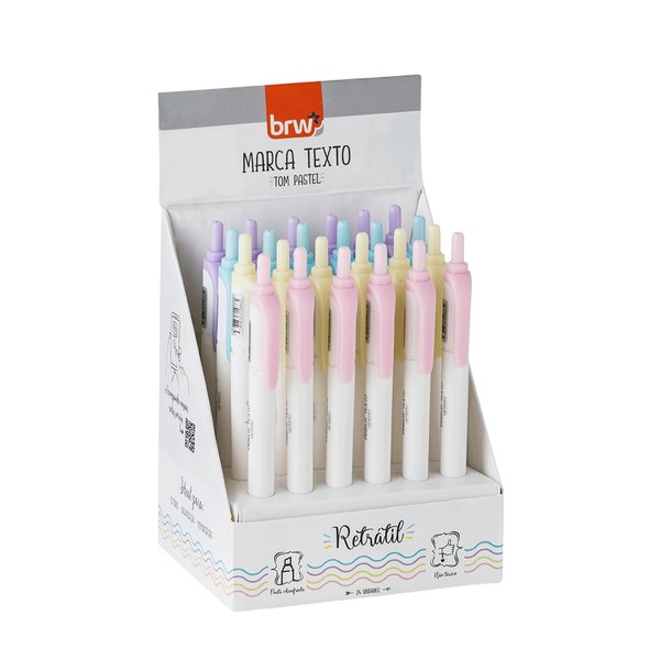 O Marca Texto Retrátil Pastel da BRW é o companheiro perfeito para quem deseja destacar informações importantes com estilo e suavidade. Com quatro cores em tons pastel, é possível criar marcações delicadas, sem sobrecarregar o texto e facilitando a leitura. O design retrátil do marca texto oferece praticidade, evitando a perda de tampas e protegendo a ponta chanfrada quando não está em uso, garantindo maior durabilidade ao produto. O corpo clean e redondo, complementado por um prático clip de bolso, facilita o transporte e manuseio, tornando o estudo ou trabalho mais ágil e organizado. A ponta chanfrada permite a criação de traços finos ou grossos, adequando-se às diferentes necessidades de marcação, seja em livros, apostilas ou documentos. A marca BRW é reconhecida pela qualidade de seus produtos, garantindo satisfação e eficiência na utilização do marca texto.