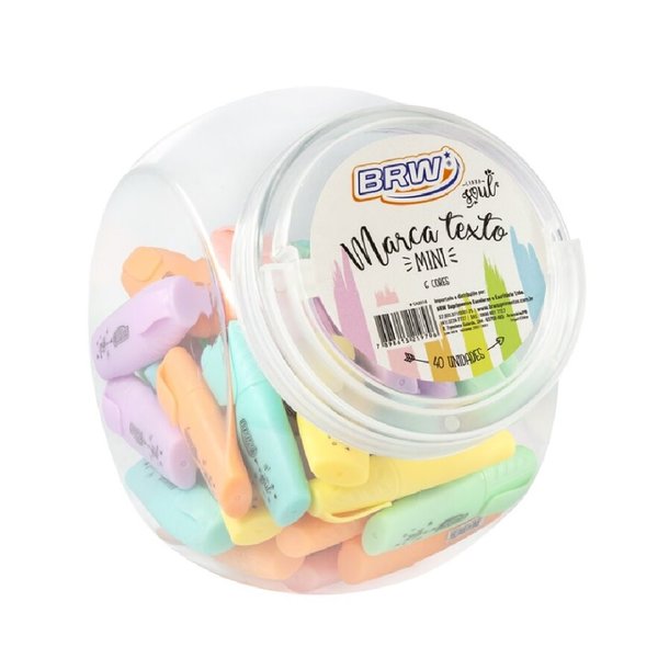 Com tom mais suaves, o mini marca-texto pastel BRW traz cores clarinhas que dão um ar delicado e sofisticado em suas marcações. Possui ponta firme e chanfrada, o que possibilita duas espessuras diferentes para seus traços. Seu corpo é em formato anatômico, o que proporciona conforto e firmeza na hora do uso. Além do tamanho mini permitir facilidade para levar e guardar em qualquer lugar.